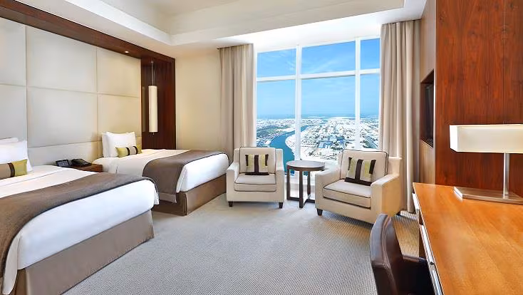 • 🛌 雲端客房: 設有大理石浴室與豪華床鋪,透過落地窗可飽覽絕美的杜拜天際線景觀。